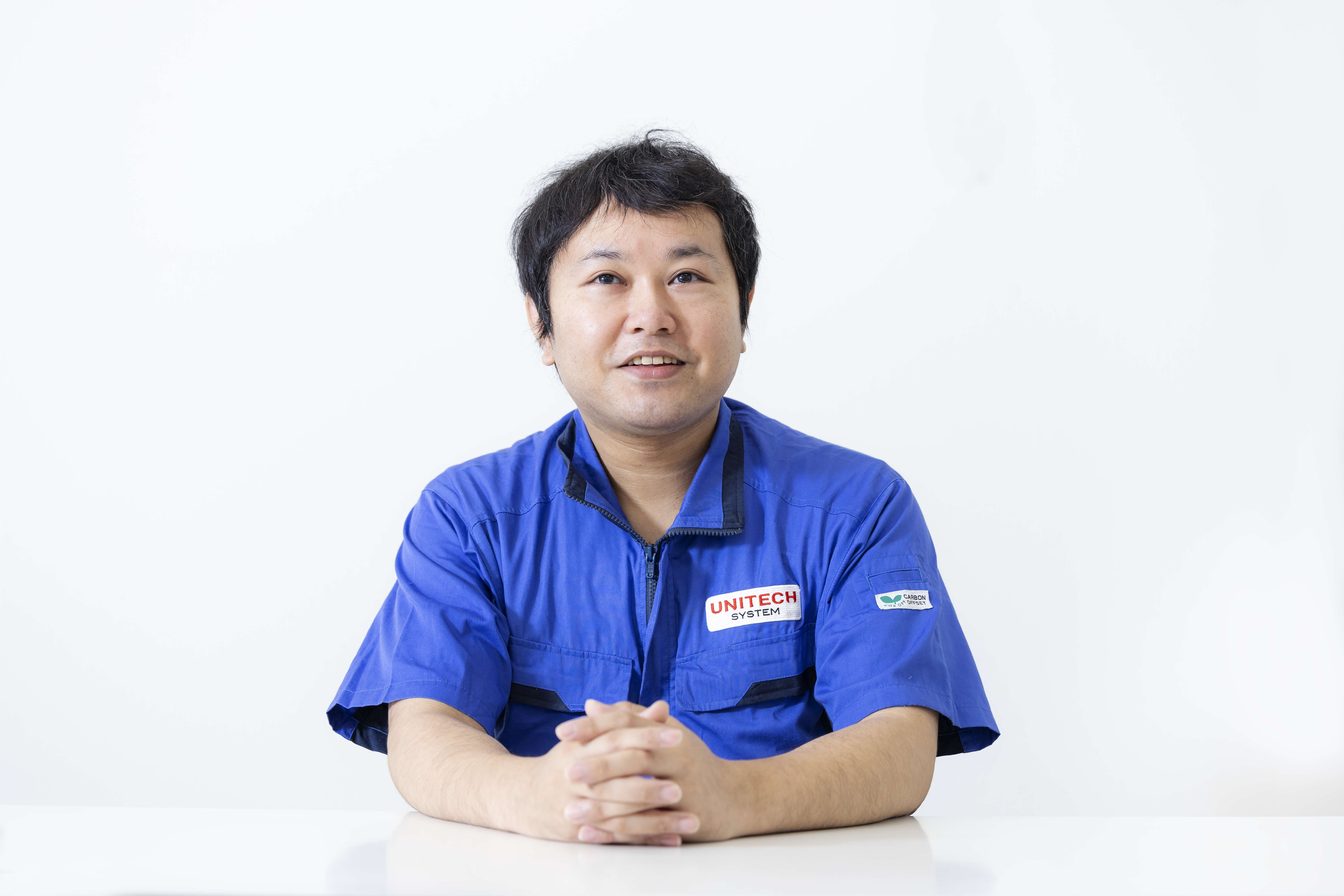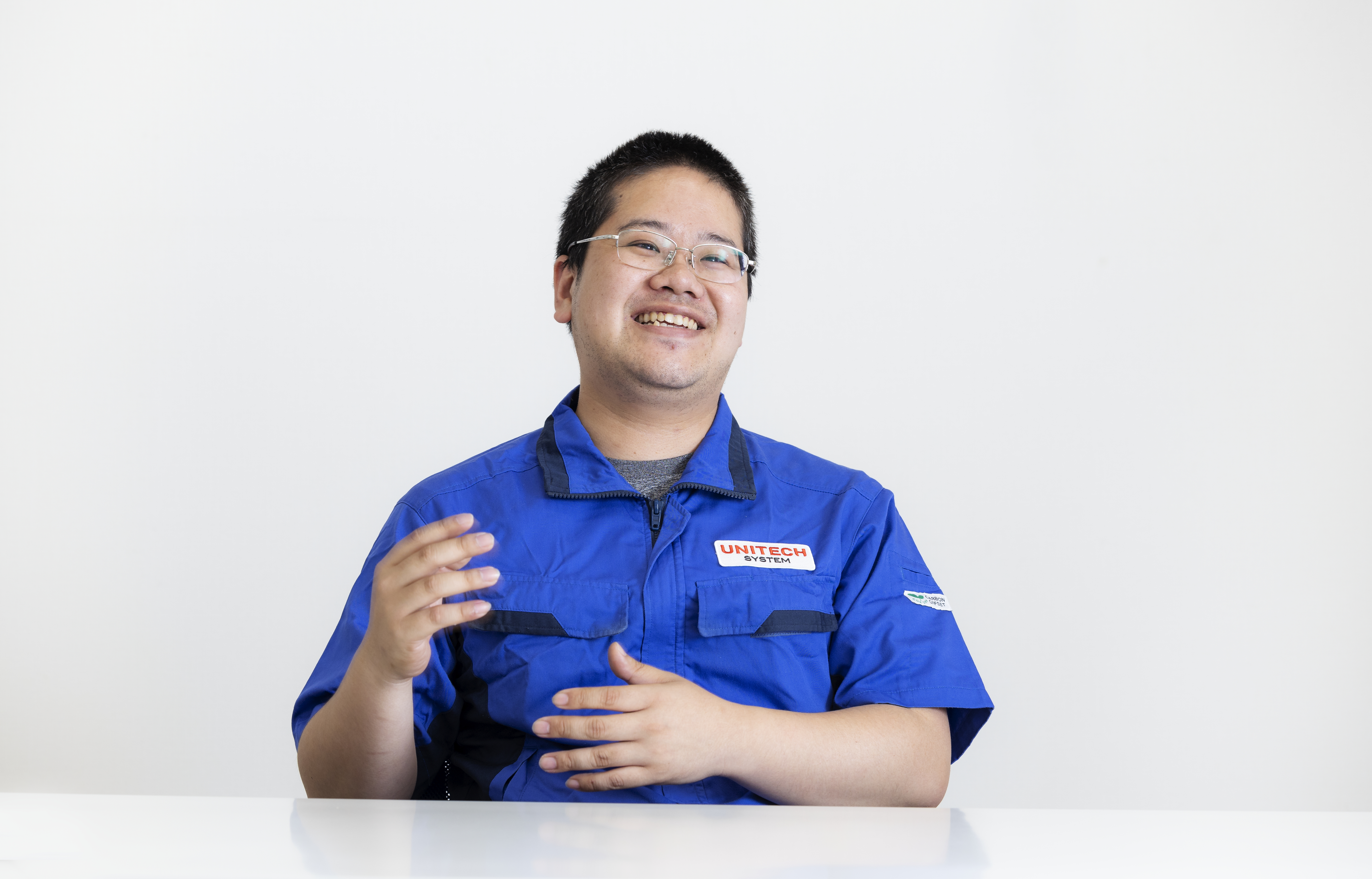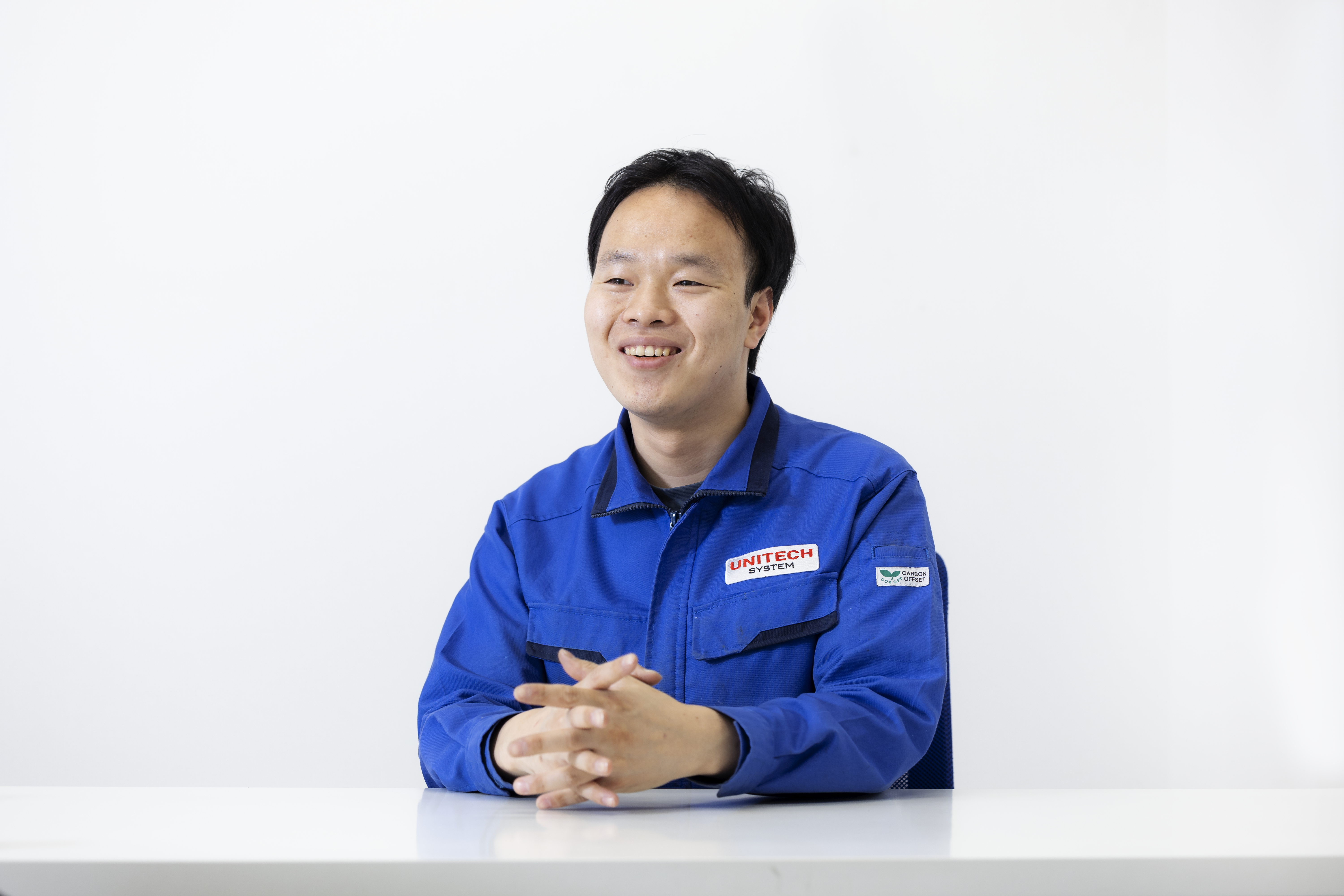 我負責維修客戶工廠內的設備與機器,雖然是接觸機器的專業工作,但我其實是在毫無相關經驗的狀態下展開這份工作的,因為我之前是在藥妝店工作,做了兩年左右。當時變更店面陳列的經驗讓我體驗到跟產品打交道的樂趣,於是開始尋找製造業的職缺,轉換工作到UNITECH SYSTEM。能修理機器而非製造機器這點讓我很興奮。也因為我是在毫無相關經驗的情況下進入公司,所以學習到很多,也確實感受到自身成長。徹底發揮所學的技能與知識、順利修好機器的當下,總是帶給我相當大的成就感。